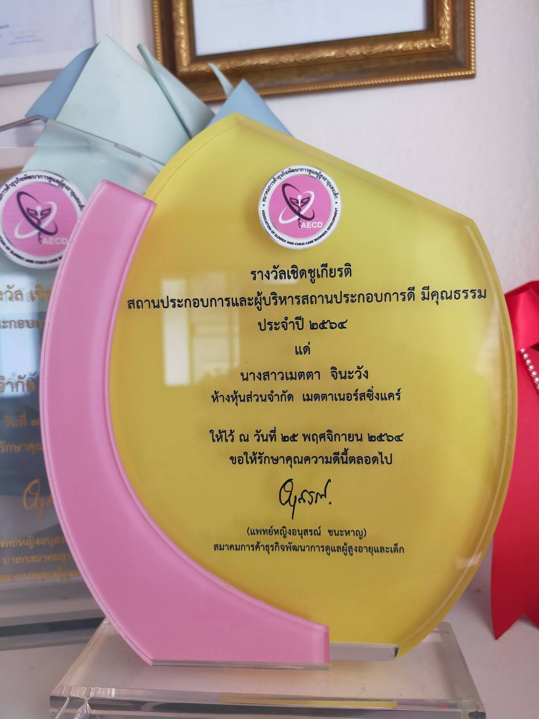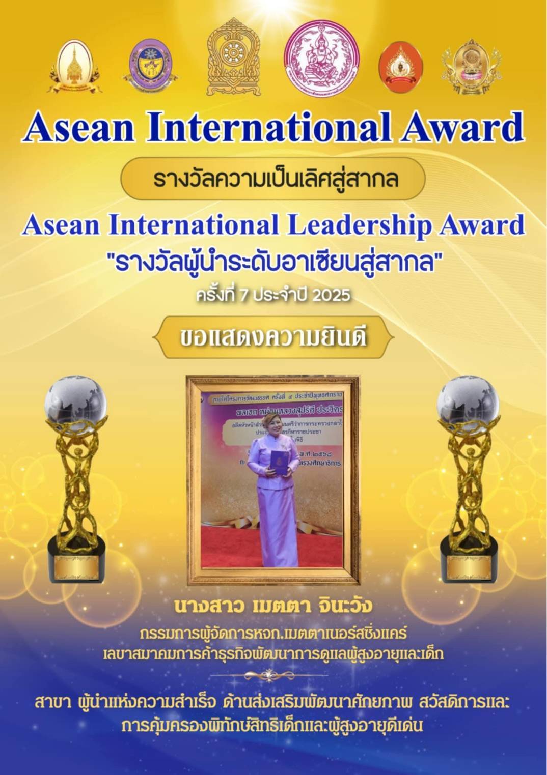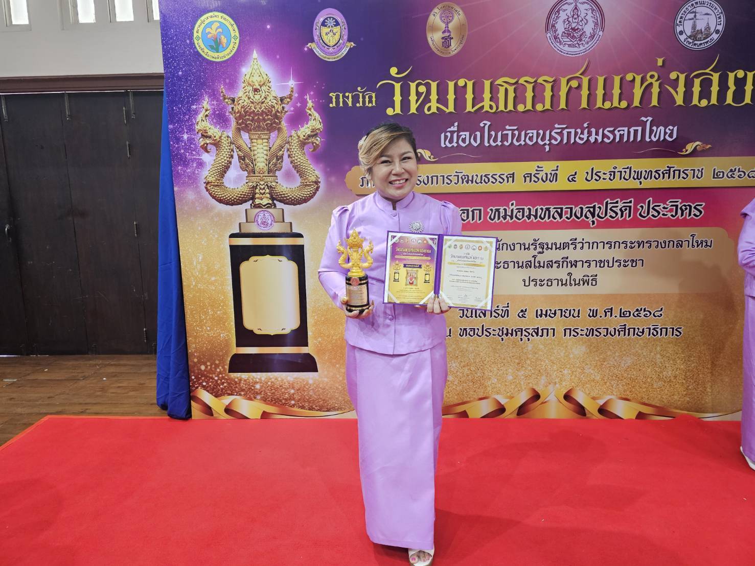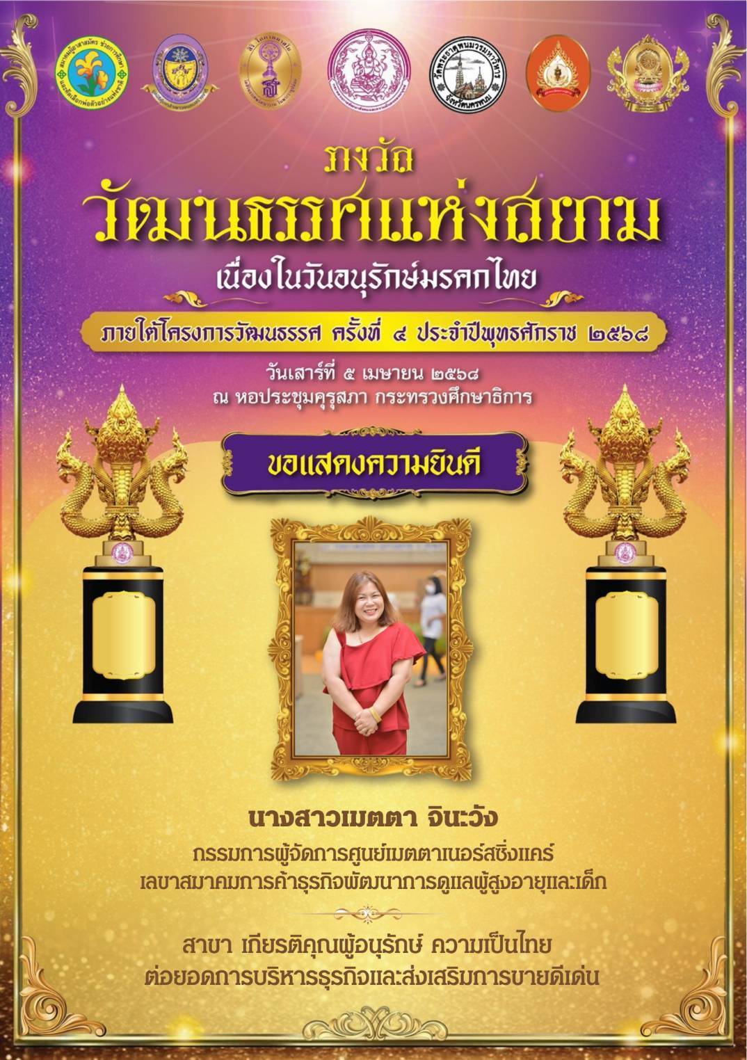 คุณเมตตา จินะวัง ผู้บริหารศูนย์เมตตาเนอร์สซิ่งแคร์ ได้ขึ้นรับรางวัลโล่เกรียติยศในงานวัฒนธรรศแห่งสยาม เนื่องในวันอนุรักษ์มรดกไทย สาขาเกรียติคุณผู้อนุรักษ์ความเป็นไทย ต่อยอดการบริหารธุรกิจและส่งเสริมยอดการขาย เมื่อวันที่5เมษายน2568 ณ.ที่หอประชุมคุรุสภา กระทรวงศึกษาธิการ