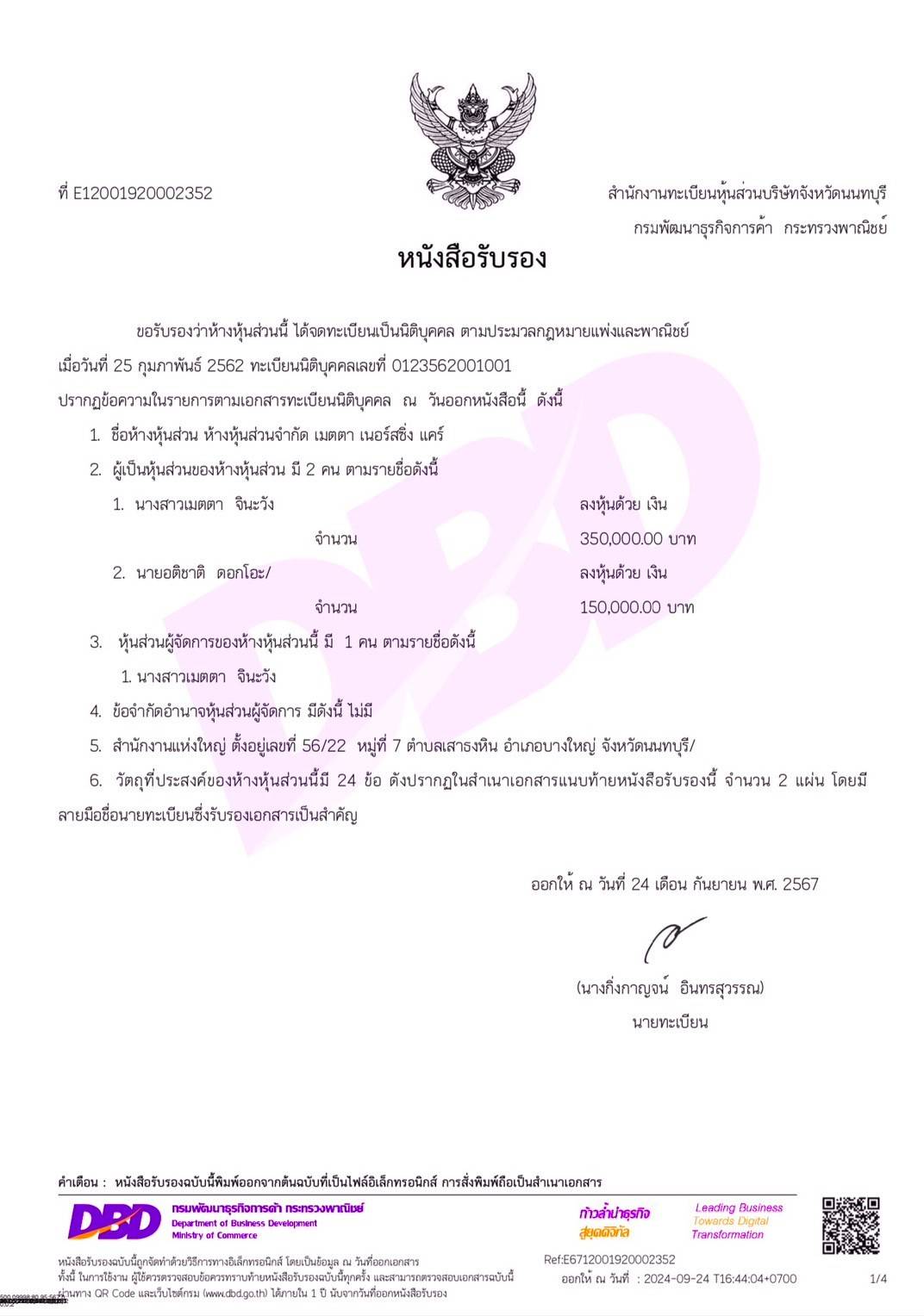 หจก.เมตตา เนอร์สซิ่ง แคร์ ได้จดทะเบียนถูกต้องตามกฎหมาย