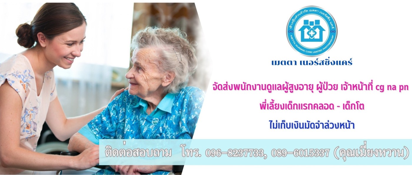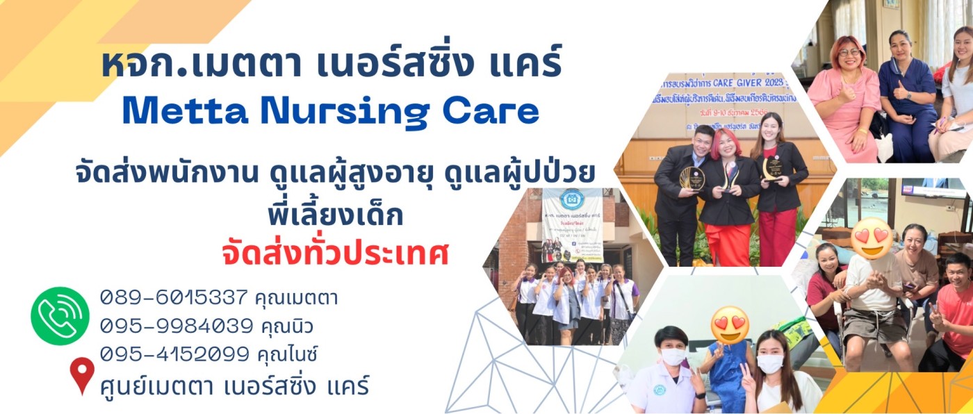 ศูนย์ เมตตา เนอร์สซิ่ง แคร์ เราให้บริการจัดหาผู้ดูแลผู้สูงอายุ แม่บ้าน พี่เลี้ยงเด็ก เจ้าหน้าที่ของเราผ่านการฝึกอบรมโดยตรงจากหัวหน้าฝ่ายศูนย์พยาบาลวิชาชีพ ท่านมั่นใจได้กับการบริการที่มีคุณภาพและถูกต้องตามหลักวิชาการ ในปัจจุบันการทำงานที่ต้องแข่งขันกับเวลาท่านอาจจะมีเวลาไม่เพียงพอในการดูแลบุคคลที่ท่านรัก ทางศูนย์ เมตตา เนอร์สซิ่ง แคร์ จึงขอโอกาสแบ่งเบาและอำนวยความสะดวกท่านด้วยการดูแลบุคคลที่ท่านรัก ดุจเสมือนท่านดูแลด้วยตัวเอง